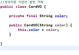 - VO의 경우 특정 값 자체를 표현하기 때문에 불변성의 보장을 위해 생성자를 사용하여야 한다.