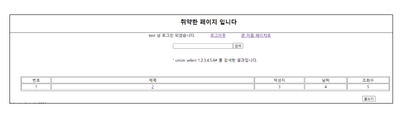 예시는 다음과 같다. union select 1,2,3,4,5,6을 입력하게 되면서 번호, 제목, 작성자, 날짜, 조회수와 같은