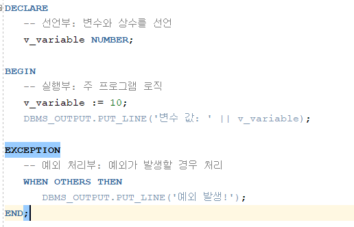 PL/SQL 프로그램은 기본적으로 세 가지 부분으로 나뉘어진 블록 구조를 가진다.