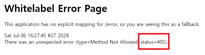 왼쪽은 URl요청(Get요청)이고 DeleteMapping과 호출방식이 일치하지 않는다. 그러므로 다음과 같이 컨트롤러를
