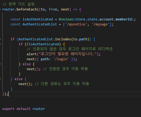 2) AuthenticatedList.includes(to.path)를 통해서 걸러야 할 페이지를 등록한다.