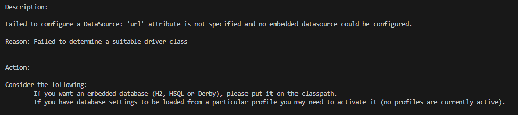 이 메시지는 프로젝트가 실행되면서 데이터베이스 연결 설정을 찾지 못해 발생하는 일반적인 메시지다. 주된 이유는 Spring Boot가 기본적으로 데이터베이스 설정을 찾기 때문에, 적절한 설정이 없을 때 임베디드 데이터베이스를