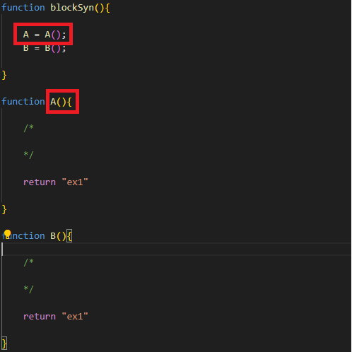 그러면 A함수가 실행되면서 A에 대한 제어권은 function A()가 계속 가지고 있는 것이다. blockSyn함수에서는