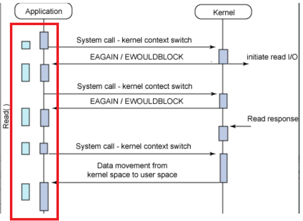 어플리케이션에서 Read()를 호출해 커널에 read I/O를 요청하면, read가 끝날 때까지 application은