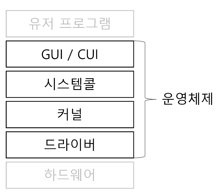 운영체제의 정의 : 하드웨어와 소프트웨어(유저 프로그램을)를 효율적으로 관리하는 역할을 한다.